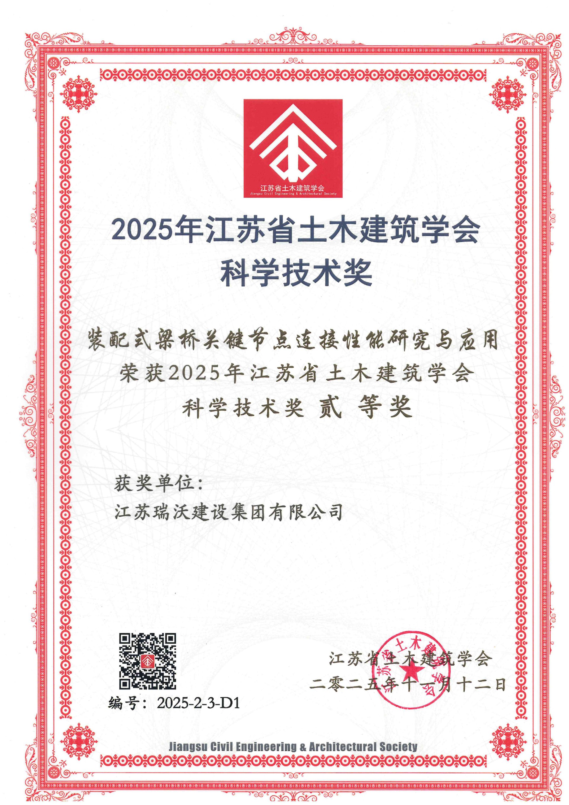 近日,江蘇省土木建筑學(xué)會(huì )十一屆理事會(huì )第五次會(huì )議在南京召開(kāi),會(huì )議正式公布2025年度江蘇省土木建筑學(xué)會(huì )科學(xué)技術(shù)獎評選結果。集團完成的《裝配式梁橋關(guān)鍵節點(diǎn)···
